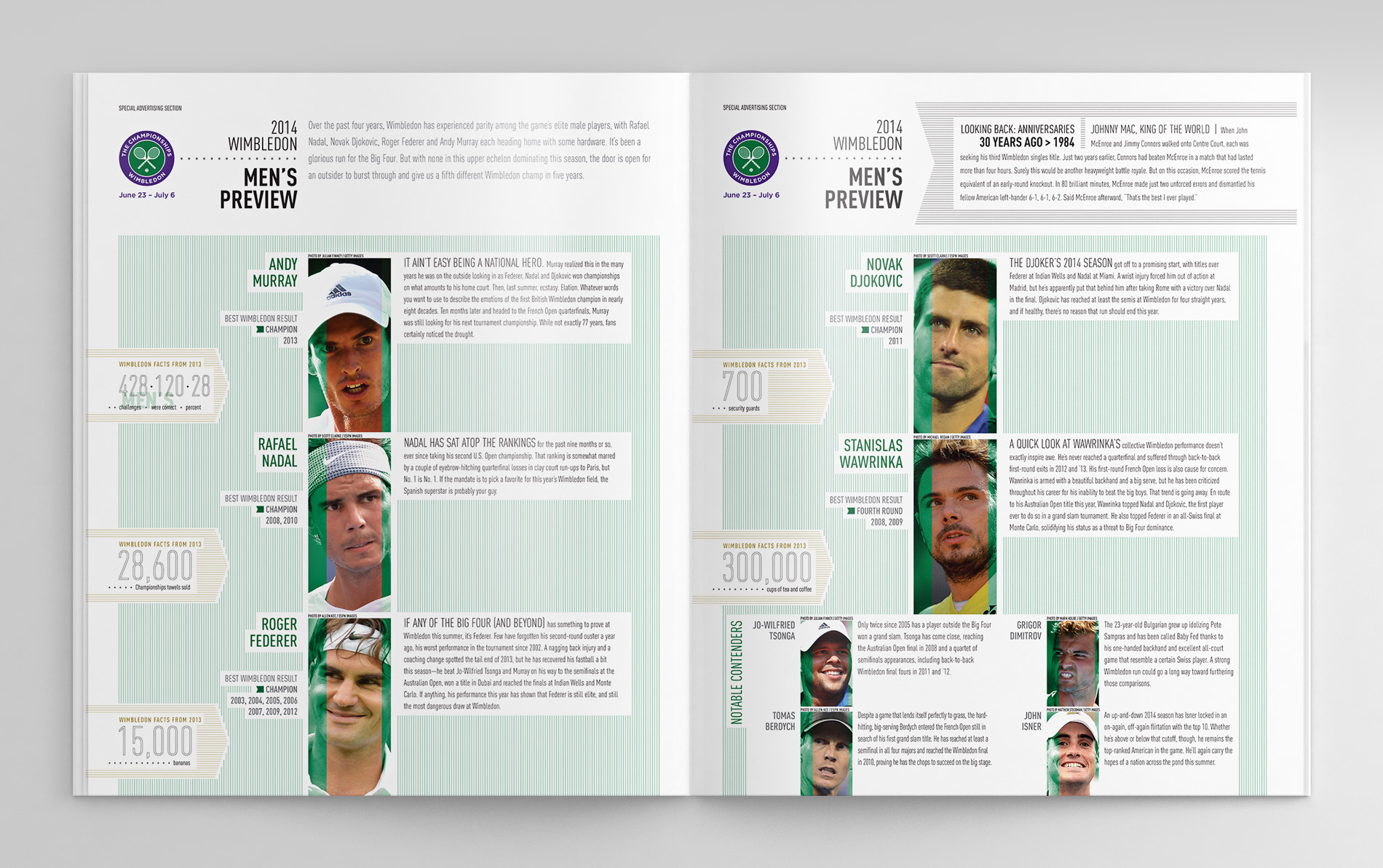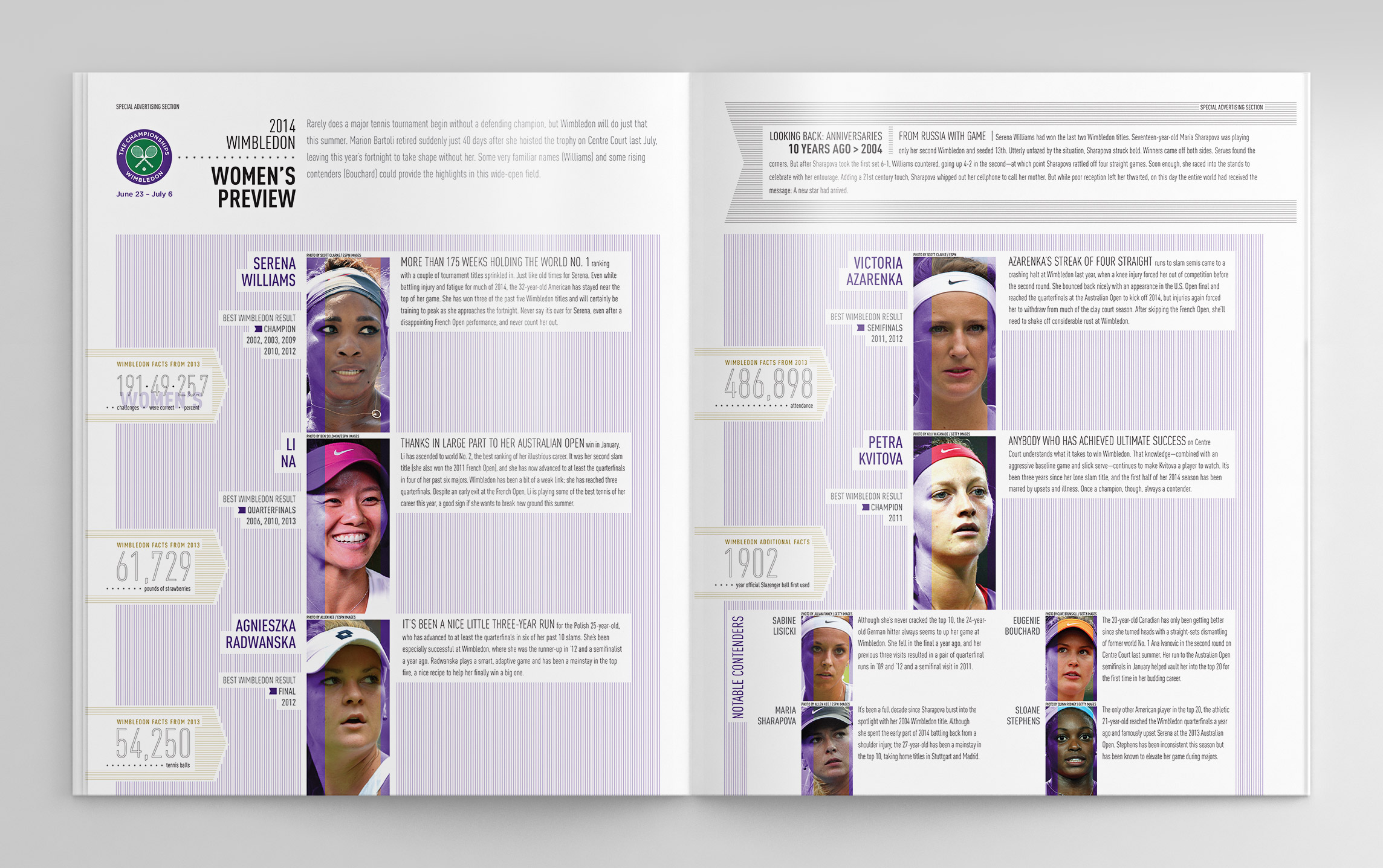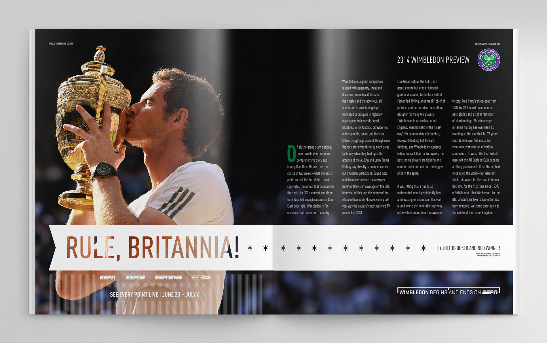 I was able to serve as art director for a couple years on a magazine advertorial highlighting the annual Wimbledon Tennis Tournament. After establishing a look and feel first, I then moved on to direct a print designer throughout the process of producing the special section ensuring they followed the original vision for the project.