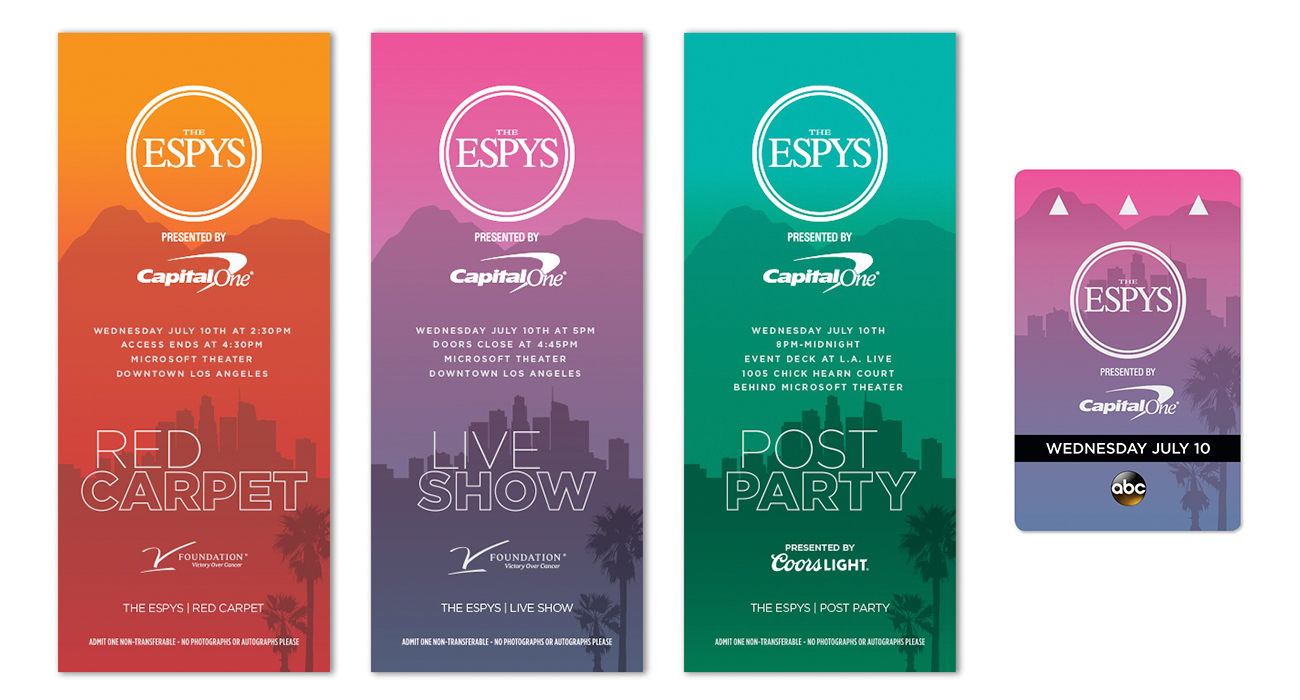 This job started out as design and layout for the 2019 ESPYS event tickets, but quickly turned into a full-on multimedia campaign. After establishing the look and feel of ticket art, I was tasked with translating that treatment to several different mediums from digital, social, television, and event design. As creative lead I was able to direct the talent photoshoot capturing several images needed for both ABC and ESPN's marketing materials leading up to the big event. This campaign alowed me to not only set the overall vision but also let me get down in the dirt with design, edit, and the development of all 2019 ESPYS marketing media.