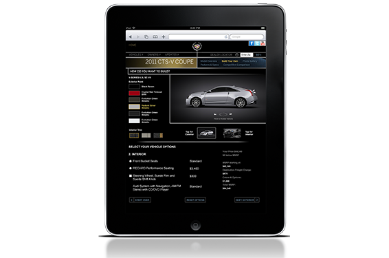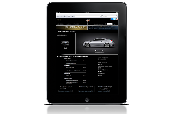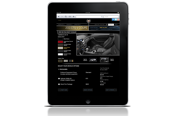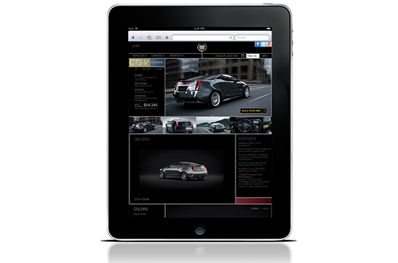 The Cadillac tablet site was enhanced with a 'Build Your Own' feature that included 360° views of both the interior and exterior of your custom built Cadillac.