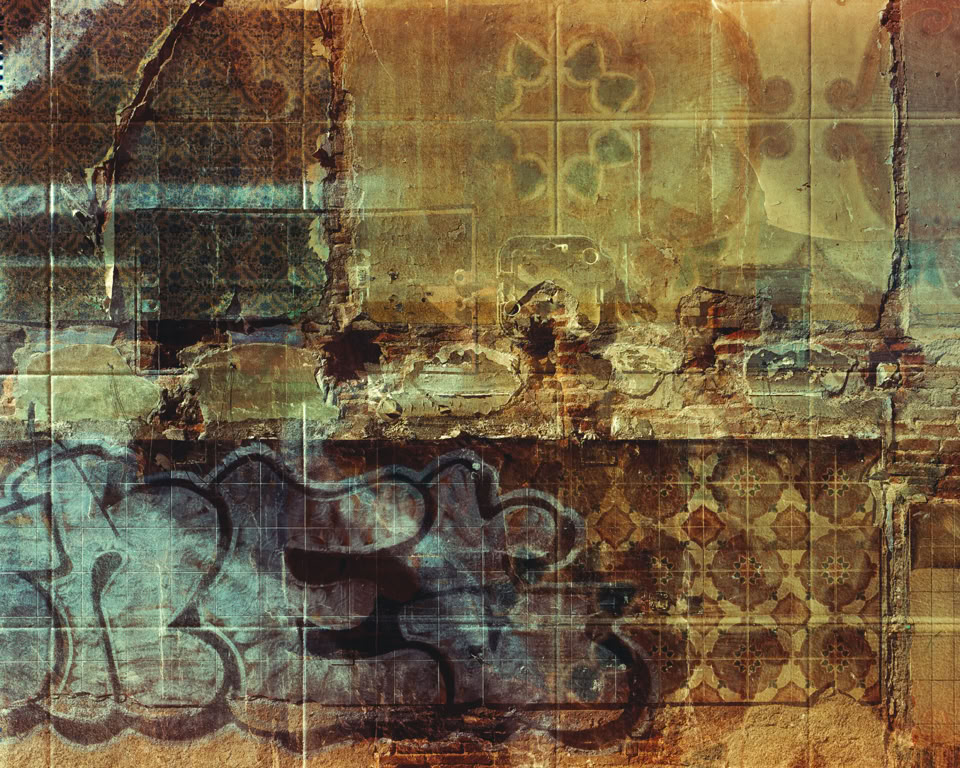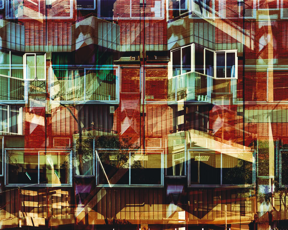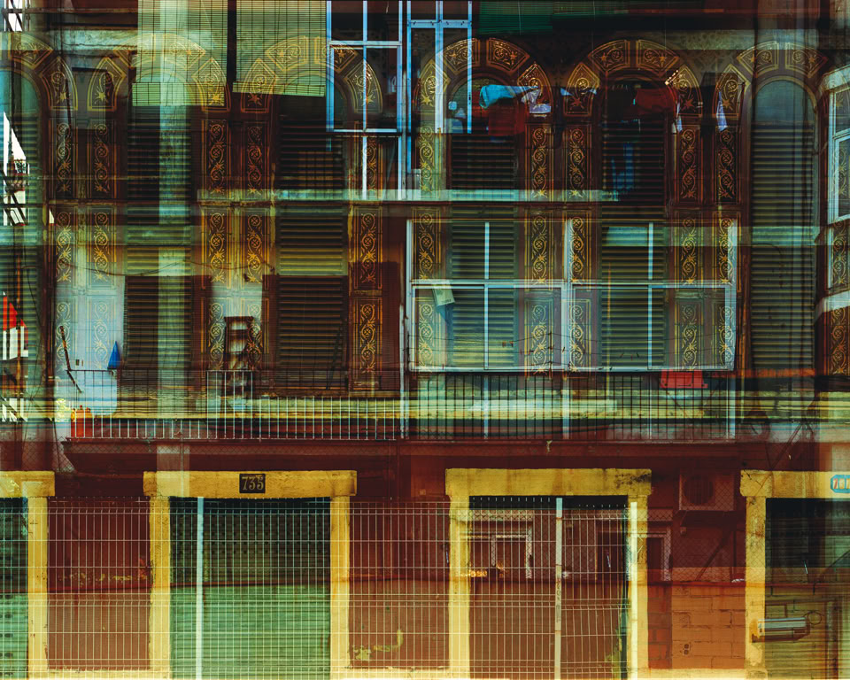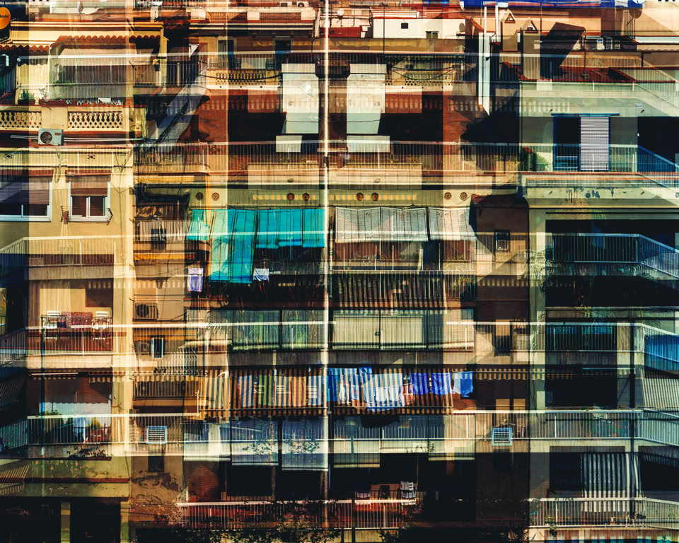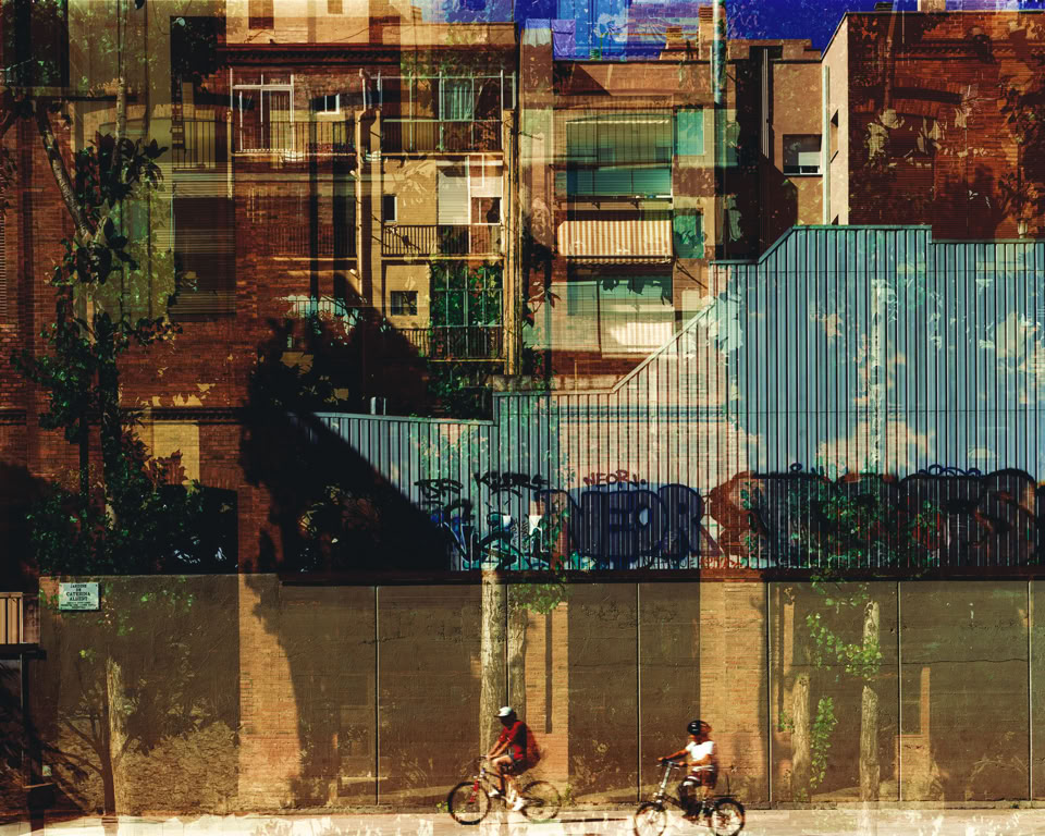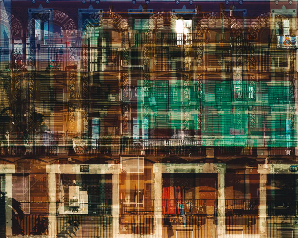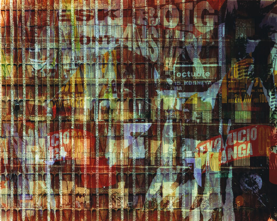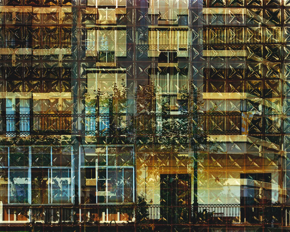 The final prints in the series have between two and five individual images layered as multiple exposures, made on location at the time on one sheet of 5x4 inch film. Each image layers architectural cross-sections of the medieval Old City and the modernist L’Exiample as grids that blend together to form organic inter- textures, revealing evidence of life the citizens have etched onto the urban surfaces.