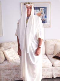could be wearing a traditional Arabian dress, "thawb", or