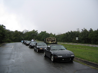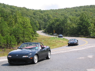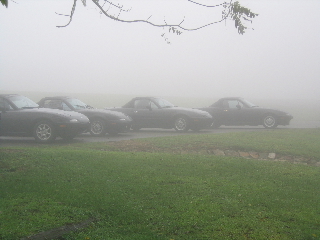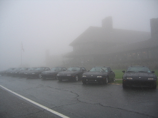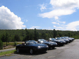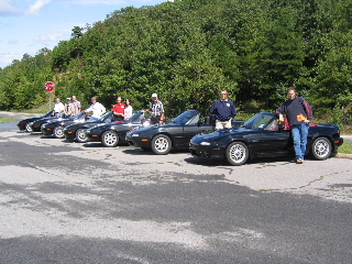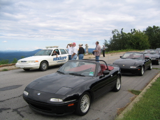 Awakening Saturday morning was quite a shock. The fog was so dense and mysterious, you could barely see the cars in the parking lot. As the Lodge is situated high in the mountains, the clouds descend upon the Lodge with the cool morning air. Then the rain began to start. We were desperate to get a group picture together, so we lined up the cars in the wet drizzle. The moral was getting low and we lost some LEs to the weather as they began their journey back home. Within two hours, the loyal and hopeful LEs experienced drastic changes. The clouds ascended back into the sky, the rain ceased and the sun proclaimed the mountains again, drying the roads for a rewarding miata drive. We lined up and drove all day long through magnificent mountain roads and twisties. We highlighted our trip with the most scenic of the twenty-six scenic overlooks and vistas. Many of the turns marked 25 mph were tackled by 50 mph speeds with our agile apex cutters. Autocrossing through the mountains was one of the best drives I have experienced...
