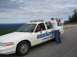 ...until we peeked over the next hilltop to find a police car waiting for our arrival. We continued cautiously down the road until our pack began to slow and signaled to pull over. Stopping at the next scenic vista, the Sheriff surveys our intentions and stops at the lead car. As I swallowed my tongue, I answered Sheriff "Bob" and explained the significance of our prided miata and the 10 year Anniversary Reunion. I was relieved when he simply wanted to follow us to learn about this unique car, since the usual packs seen along these roads were motorcycles. The roads were once again free to roam as the Sheriff continued down the scenic byway.