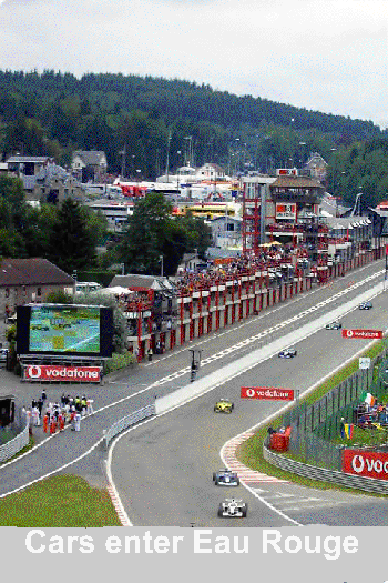 the downhill run to Eau Rouge. You see the cars as they exit the hairpin at
