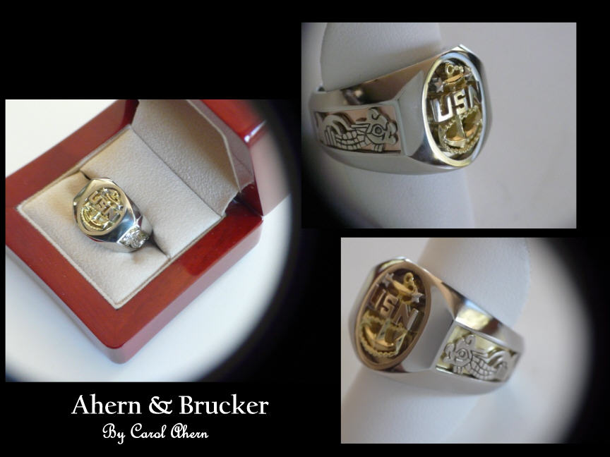 I just got it today! Thank you so much, it’s beautiful! He loves it thank you. All of his groomsmen were very jealous…mission accomplished J Sabrina ______________________________________________________________________ March 8, 2010  Hi Bob, I could hardly believe my eyes when I opened the box that held my “CPO RING”. It took my breath away! I was stunned! The ring was a masterpiece. I had seen pictures of it but the actual ring waiting to be placed on my finger…Awesome! It was mine! I received the ring as a gift from my family when I was recently promoted to Navy Chief. I wear the ring with great pride. I am honored to have received this ring. When I wear it other Chiefs have complimented the ring, some with envy. My gratitude to Ahern & Brucker for designing the military “CPO RING”. Your detailed and precision craftsmanship is unbelievable. Best regards, Chief Brian Pearson _______________________________________  Bob & Carol, I wanted to let you know I received the ring and it was way beyond expectations! What a fantastic job! I'm glad I had the opportunity to finally order my ring - it is now my prized possession. All my thanks for the EXCELLENT customer service and AMAZING craftsmanship. I wish you and your family all the best for the holidays and health and happiness for the New Year. All my best, Jeff