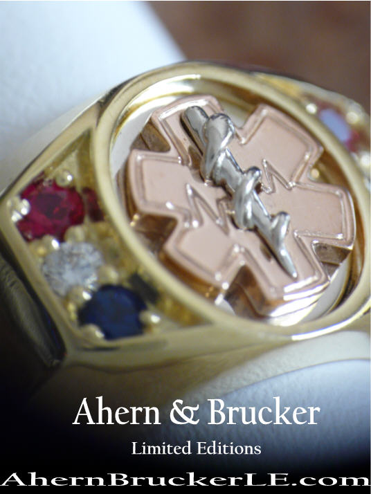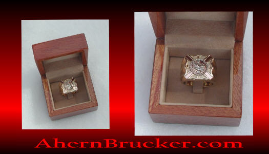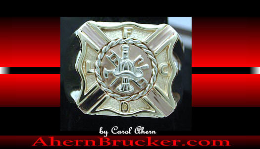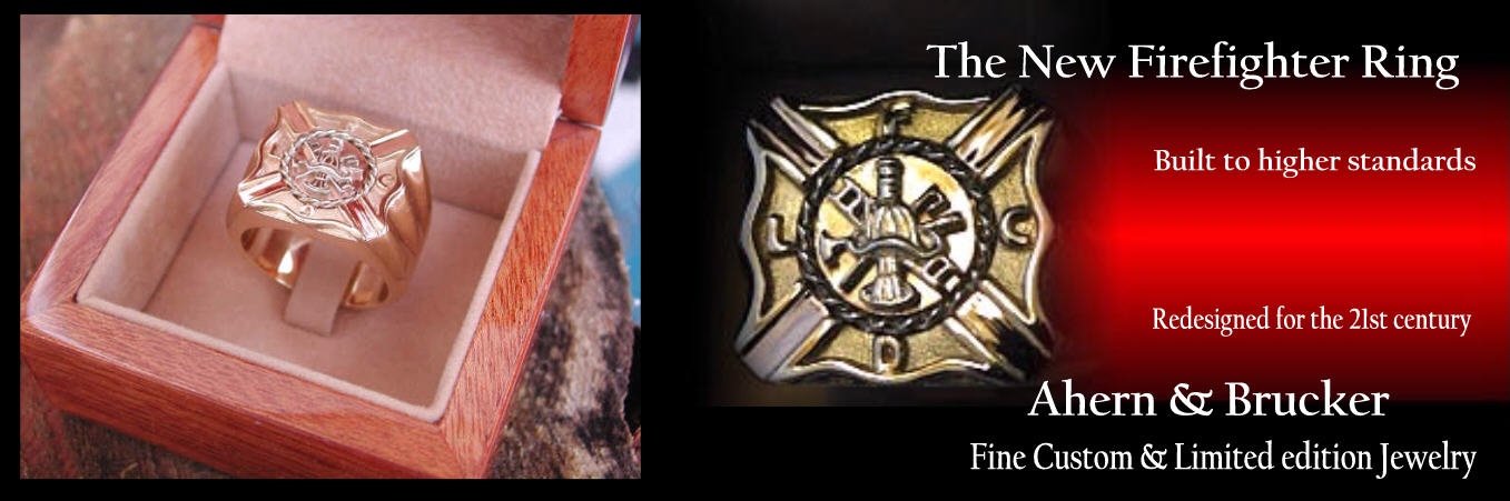 | Ahern & Brucker Fine Custom Jewelryby Master Goldsmith Carol Ahern We proudly introduce our version of the Firefighter Ring from our Basic Man's collection Designed and made without compromise for those who want the very best that can be had. by Carol Ahern-Master Goldsmith A ring that will give you a lifetime of pride in ownership and equal pleasure in passing down to future generations." and the comfort of knowing, an investment that will at least hold it's value through time.