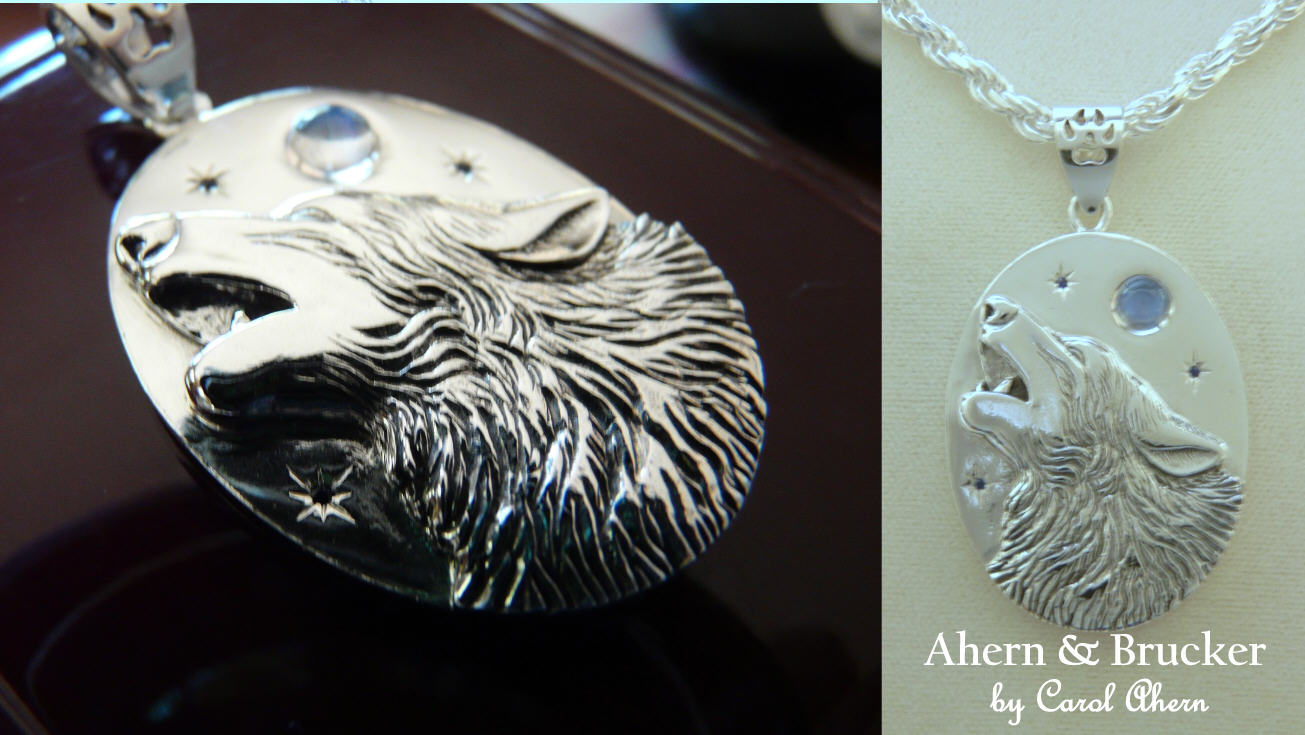 Welcome to Ahern & Brucker Custom Wolf Rings & Accessories ______________________________ Large Wolf pendant & Paw print bail with moonstone & sapphires Available in Sterling, Palladium, 14k, 18k and Platinum Your choice of gem stones.