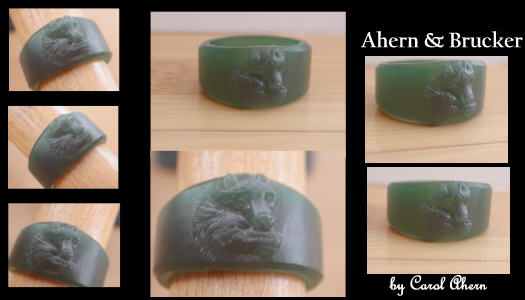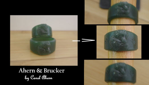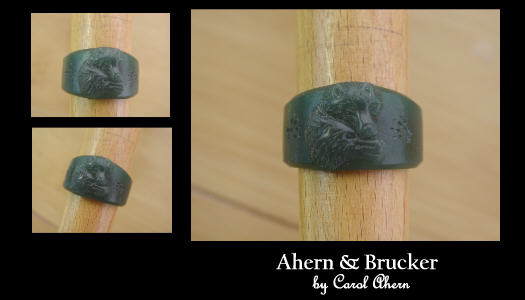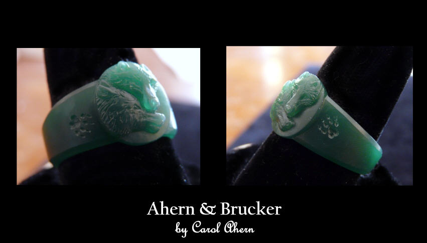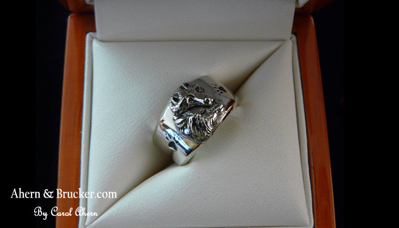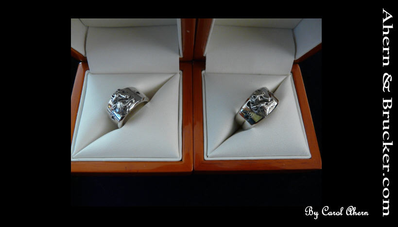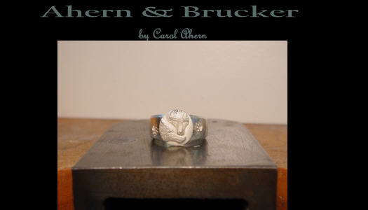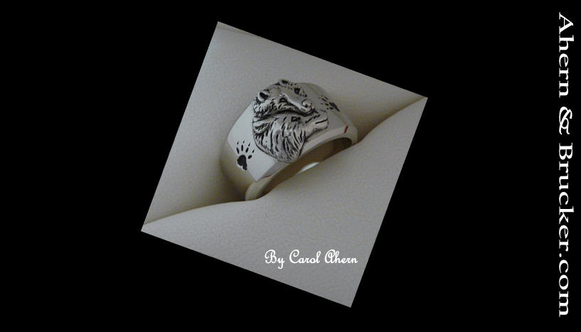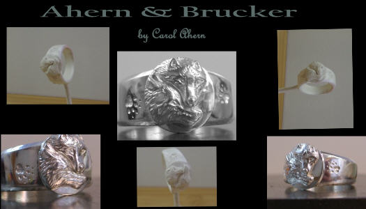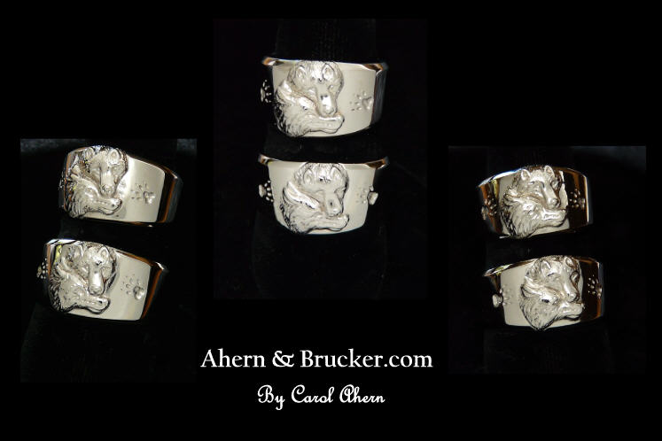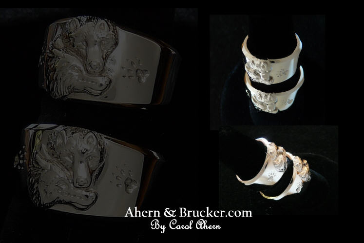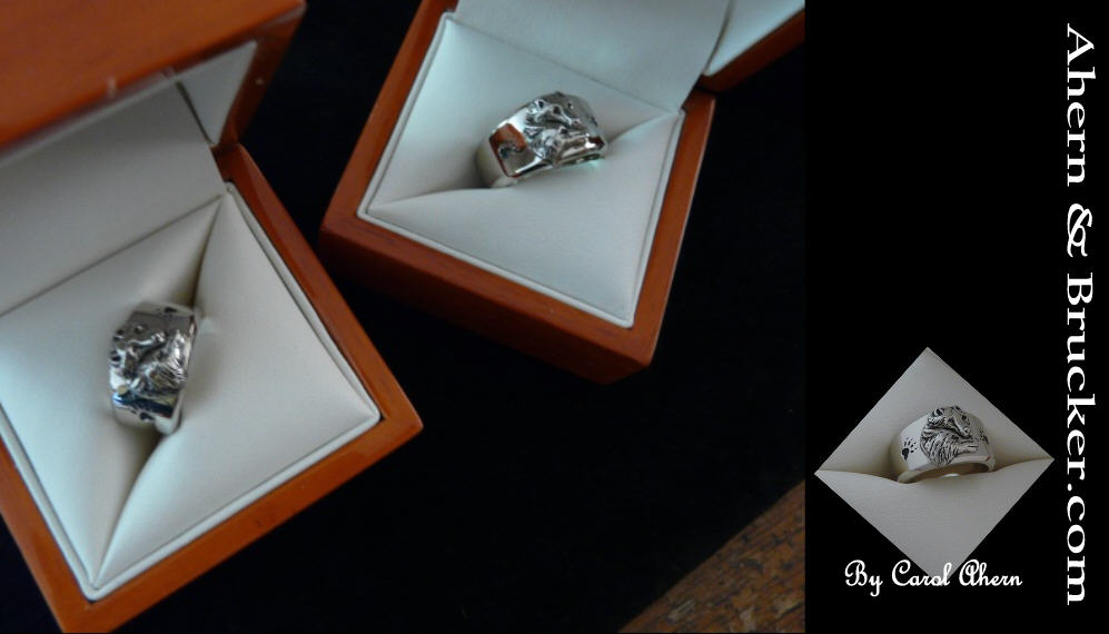Home About Us Contact info Custom Orders Customer testimonials Portfolio Men's dept Basic man's ring Wedding ring Collection Yin Yang Collection Wolf ring Collection Forest Collection Military Firefighter Collection Freemason Collection EMT Collection Dragon Collection Whistle Collection Hand forged Accessories Gems & Stones Mothers day Rare earth Listings Pricing Affiliate program Sponsorships Fundraising Inquiries | Welcome to Ahern & Brucker Fine Custom Jewelry designs & Limited editions by Master Goldsmith Carol Ahern A commission from start to finish Our newest wolf wedding set in 18k white gold.