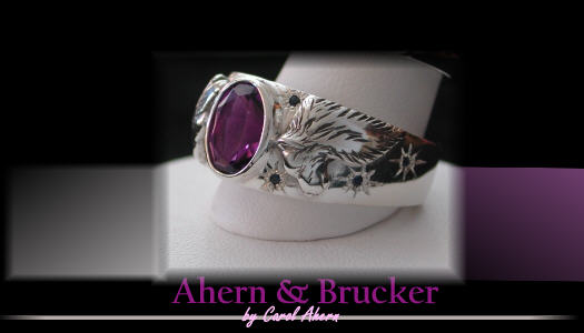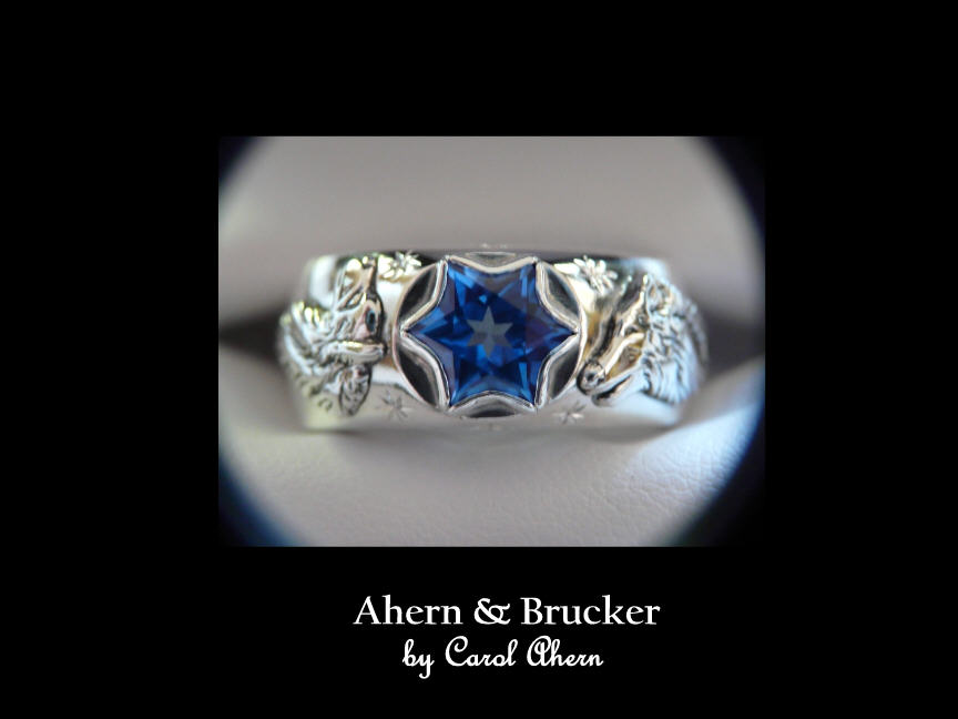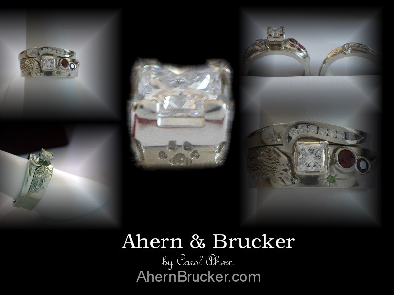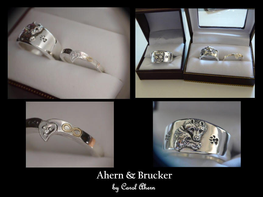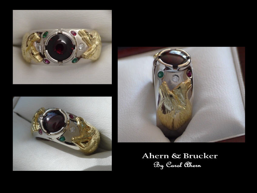 Home About Us Contact info Custom Orders Customer testimonials Portfolio Men's dept Basic man's ring Wedding ring Collection Yin Yang Collection Wolf ring Collection Forest Collection Military Firefighter Collection Freemason Collection EMT Collection Dragon Collection Whistle Collection Hand forged Accessories Gems & Stones Mothers day Rare earth Listings Pricing Affiliate program Sponsorships Fundraising Inquiries | Ahern & Brucker Fine Custom Jewelry designs & Limited editions by Master Goldsmith Carol Ahern For this time of your life when "off the rack" will not suffice..