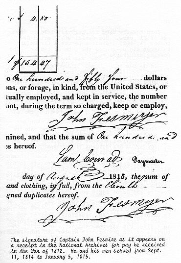 For his services the Captain received $154. 47 and for it signed a receipt which is in the National Archives. Present day Fesmires will be interested to know he spelled his name "Fesmyer." The men of his company, in addition to pay they were given at the time, subsequently received bounty land in the western states. Peter Fesmire, typical of many, received 40 acres in Tazewell County, Illinois in 1850 and sold them in 1852. Later he was given 120 acres near Fort Dodge, Iowa which he sold in 1857. In a written statement he says, "I was a private in the Rifle Company attached to Col. Thompsonts regiment at Camp as Marcus Hook, and the said company was commanded by my father, Captain John Fesmire.11