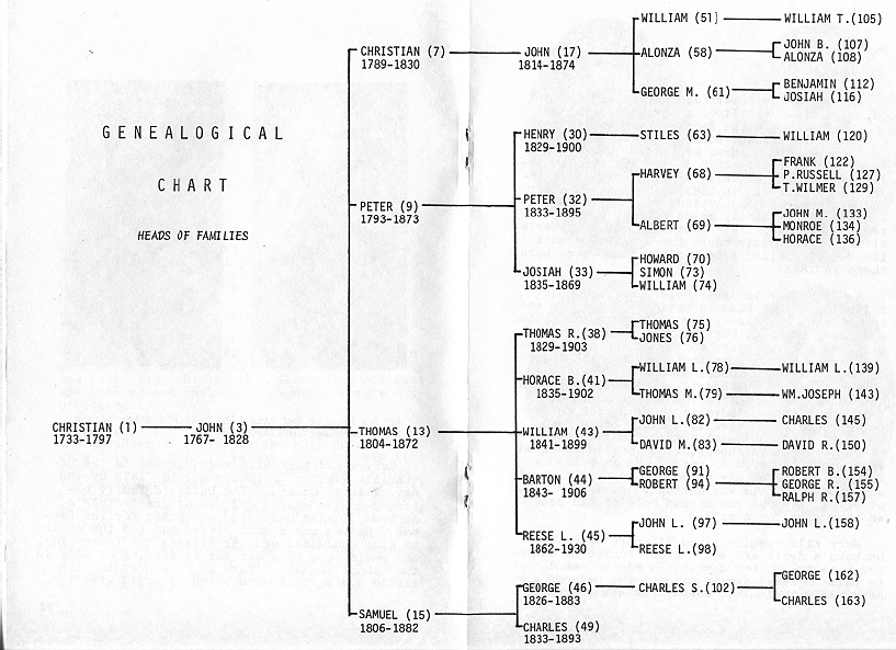 Web owners note: This genealogical chart may take a few minutes to download. It is a double page from Lloyd's booklet which traces from Christian Fesmire (1733-1797) for five generations. The genealogical pages on this web site continue through later generations. My grandfather is Horace, number 136 on this chart.