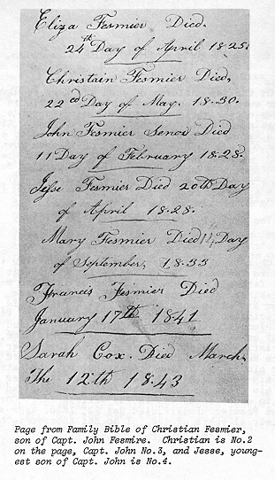 Christian, the eldest was born about 1789 in Oxford Township. He served as lst lieutenant in his father's company in the War of 1812 and was a cabinet maker, possibly learning the trade from his uncle John Bowler. The Philadelphia directories from 1816 to 1830 list his shop first at Plum Street, then on Catherine Street, and last on Callowhill near 9th. One of his sons, Christian Lafayette, was a soldier in the War with Mexico. I have not located a war record for him in the National Archives, but the date of his death-- May 22,1846-- and a GAR marker on his grave at Pennypack Baptist Church lead me to conclude he was in the Mexican War. Christian Fesmier himself died May 22, 1830, approximately 41 years of age. I do not know where he is buried.