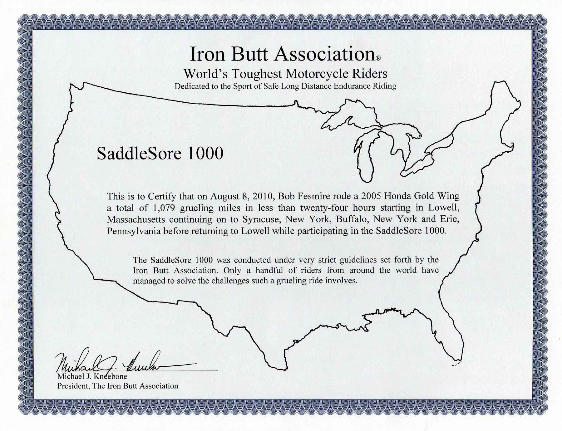 I'm home and I'm happy. It took a while for the adrenalin to wear off. Then I had a great night's sleep. :-) --------------------------------------------------------------------------------------------------------- Update: About 3 months later my ride was certified by the Iron Butt Association and this showed up in my mail box.