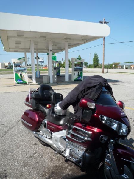 I'm feeling rather pumped up. I've done half of the 1,000 miles and now I know I'll be able to complete the remaining miles. It's a good feeling knowing that you will accomplish what you set out to do. I just need to keep doing what I've been doing - focusing on the next leg and not thinking beyond that. And ride safe. I promised my wife that I would call her at the half way point. It was fun to share the "I'm gonna do this thing" feeling with her. She is always supportive of everything I want to do. While on the call I found myself looking for shade from the sun. The temps were over 80 degrees. Time to wet my LD Comfort shirt. It's a long sleeve double layer shirt made just for this. It has high tech material with the inside layer designed to wick perspiration to the outer layer which then evaporates the moisture. While in the men's room (did I mention the drinking and being old) I soaked the shirt. It must hold close to 2 pints of water. While riding I adjust the after market "wings" on the bike to control how much air passes through my jacket. The evaporative cooling is rather amazing. It keeps my core temperature in check so I avoid over heating and can keep my attention on riding. This like all of my stops was between 25-30 minutes but now it's time to ride. One last picture of my bike and the BP pumps.