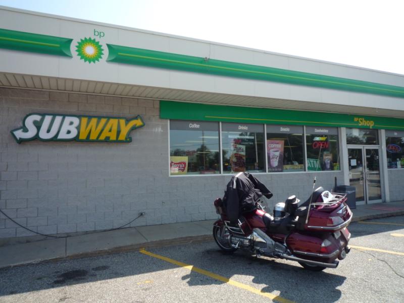 It was the first of two breakfasts this day. My second stop wasn't for another 2:45 hours unless I felt I needed it sooner - which is how I rationalized this breakfast. I had to travel out the Mass Pike into New York, past Albany and Schenectady. I had been drinking while riding (I have a mug set up on the handlebars to stay hydrated) but a bottle of cold water seemed to be just right. 6:07 am Pulled into the Iroquois Service Area on the NY Throughway. I had been concentrating on relaxing and keeping a light touch on the handlebars but the back of my shoulders were beginning to hurt a little. I must have gotten more relaxed as the day wore on, as by the second half of the ride the muscle soreness had faded. Temperatures were lower than I expected - ranging from 52 to 55 degrees for what has been about 1/4 of my planned ride. Good thing I have a heated jacket liner. I stayed nice and warm. A restroom visit (remember, I've been drinking to stay hydrated besides being an older male). :-) With a gas fill up I make the required entry into the log I keep for certification and then stuff the receipt into a waterproof bag I'm using. It is 288 miles to PA so I know I'll need another stop for gas. Shortly after being back on the road I notice the dark heavy clouds ahead. I quickly turned on the Gold Wing's radio and tune to the local NOAA weather. I hear, "rain, lightening and very gusty winds." I'm thinking what a dummy, I never actually checked the weather for western NY. I'm going to do this in heavy weather. Ugh! Then as the looped report came back to the beginning it said that today was going to have some gusts up to 15 mph (a little bothersome on a bike while on the highway but not a problem), the temps were going up to 85 degrees (I've planned for that) and there will only be a brief light drizzle in the morning. Phew! 8:30 am Pulled into the Seneca Service area and after the requisite rest room visit (did I mention I've been drinking while riding and that I'm an aging old guy) I notice there is a Tim Horton's. Hey, it's 8:30 and time for breakfast. I needed one of my favorites - sausage, egg and cheese on a croissant. It went well with a small decaf coffee. Gassed up, entered data into the log, geared up and pulled out. Next stop, Pennsylvania. Then I hit the fog, for miles at a time. Had to slow the speed down to match it to how far I can see. Sunrise was around 6:00 am but if hadn't burned the fog off yet. After about a half hour of this it cleared and I was back to cruising speed. 10:57 am Get off the highway, turn and there is the BP gas station that others have seen when using this route for their SS1000 certification. The MTF (Motorcycle Tourer's Forum) sponsored an SS1000 ride last year using essentially the same route.