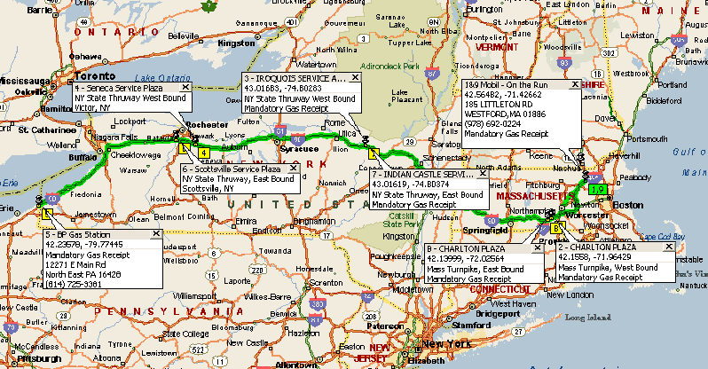 I again realize that many parts of New York are very pleasant to ride through. The Finger Lakes region has been on my list of places to spend some time on a bike. Maybe next year? 1:38 pm One of the things that makes this an "easy" SS1000 is that all the gas/rest stops are right on the highway. Easy off and back on again. Pulled into the NY Scottsville Service Plaza and make a quick stop in the rest room. I order up some food, sit down and then find myself wondering. What actually is an Arby's roast beef sandwich? It doesn't really look like beef, well not any beef I've ever gotten anywhere else. I can identify the bun part. It looks familiar but the meat stuff just doesn't seem natural. I dump a lot of red sauce that looks like another artificial food on the meat stuff and also add extra horseradish. I don't really want to taste what's inside the bun. I'm pretty hungry and try not to think about it as t slides down and fills the emptiness inside. I love food but I'm just not sure that's what Arby's serves. <grin> Gas up, enter the info in the log and stuff the receipt into the bag. Back on the road and I realize I didn't wet down the LD Comfort shirt. I'll just have to drink extra amounts of water to stay hydrated and use the moisture from my perspiration to provide the substance for evaporative cooling. This doesn't work real well as the shirt has two layers but I'll deal with it. Only about 150 miles until the next stop. When I bought my new bike in 2005 I knew the OEM seat would have to be replaced. It's just not designed for a human pushing the upper limits of most home scales. This is especially true when said human is lacking much flesh on the part that he sits. Russell Day Long built me a seat that accommodates my horizontal giftedness and limited posterior. On this leg of the ride I'm so happy that I made that investment. I've found that occasionally changing seating position allows me to ride without any significant discomfort. My route: 4:23 pm As I near my next stop I'm feeling a bit too hot. I see the signs for the Indian Castle Service Plaza and am happy to pull in and get inside. It's just not fair when they put a Nathan's hot dog place right in front of me. I guess today is not the day I'm going to lose any more weight. I get one of those big bad boys and wolf it down with a diet coke. I love hot dogs and Nathan's is second on my list. The rest room is too public for me to whisk off my LD Comfort shirt. What am I to do? Outside in the parking lot I open the cooler and pull out an ice cold water bottle and fill up my handle bar mug thingy. It then dawns on me that the cooler is filled with ice water. But how do I get it on the shirt? I'm not disrobing in public - I'd scare many women and small children. I spot the wet cloth in its plastic bag. I had it to clean the windshield if needed. Out comes the cloth, dunk it into the cold water and pat/squeeze it next to the shirt. It soaks up most of the water with some running onto the pavement. Ah, all set for the next leg and I'm a happy and cool man. Do you know that if you keep using the same credit card at multiple Mobil stations in the same day they make you go inside to show the card and sign for your purchase? One time of that and I switched to my backup credit card. That worked for a while then they stopped accepting that at the pump too. Grumble, grumble... Gas, log entry and receipt taken care of and off we go on the next to last leg. This is the long one - 2:45 hours. With only 100 songs on my mp3 player it's now on the third loop round. I've found that dealing with the boredom has been one of the bigger challenges on this ride. At least now I'm in civilization and there are radio stations. This morning the roads were all mine. This afternoon I'm having to share them with some traffic in New York and now heavy traffic on the Mass Turnpike as I get near Rt84. Lots of folks are coming from the south - Connecticut, New York or even further down the coast. 8:01 pm Pulling into the Charlton Service Plaza has me wondering if they are giving away free food or gas. It is a zoo! I'm hyper aware and watching every vehicle. I see two "almost collisions" by the time I'm parked and walking across the lot. Inside, is even worse - people everywhere, even in the rest room. I call home to tell them I'm going to be a little later than predicted due to the traffic. I'm greeted by the answering machine. It's nice to not have folks sitting around worrying about you. I leave the message, "ETA will be after 9:00 pm - it should take 1 hr but with traffic unsure of arrival time home." It's cooling down now. Good thing as I'm out of water in the cooler and I'm not going to get half naked in a crowded men's room to wet my LD Comfort down. After about 10 minutes the speed picks up to about 55 mph. I'm relieved because after all the riding I did the idea of sitting in barely moving traffic just didn't appeal to me. Before long I was going north on Rt495. Traffic was moderate but was moving along nicely. I always look for the safest place to be on a highway. The safest place is in an "open pocket" where there are few if any other vehicles. It's usually not a good idea to stay in the far right lane on a limited access highway as you can be the target of folks exiting and entering the roadway. Tonight the safest place to be is in the passing lane - even though this line of traffic is moving along significantly above the 65mph posted speed limit. I find a pocket for most of this stretch and keep equal distance between the group in front and in back. I say to myself, focus, ride safe, you don't want to mess up now. When I see the signs for exit 32, Westford, I can feel the skin stretching across the big smile on my face. A few hundred yards off the highway and I pull into the Mobil station I left 19 hours and a thousand miles ago. Pulling up to the pump for my ending gas receipt I remember that I'll have to go inside as they won't take either credit ca