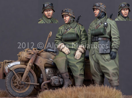 ALP35144 German Motorcycle set 1/35 scale resin (contains 2 figures with  2 different heads each), sculpted by Roddy MacDougall, box art painted by Man-Jin Kim