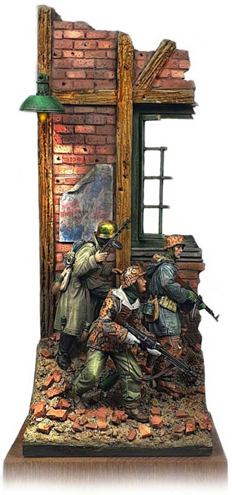 German soldiers, damaged house wall, terrain, window, street lamp cast in
