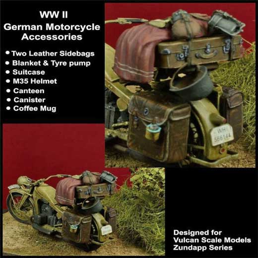 DD35081 WWII German Motorcycle Accessories 1/35th scale resin  kit sculpted by Pawel Krasicki includes two leather side bags, blanket & tire pump, suitcase, M35 helmet, canteen, canister & coffee mug