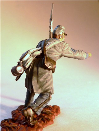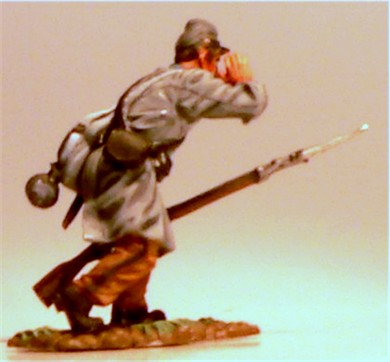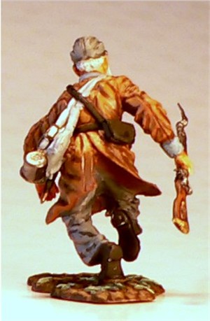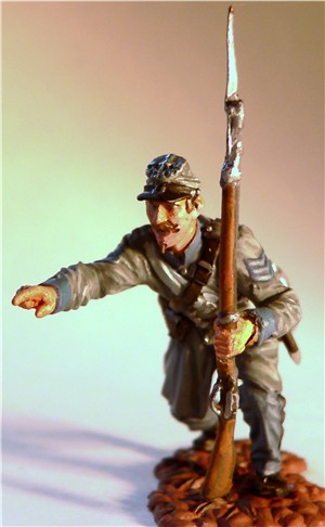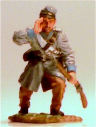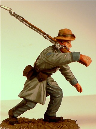 MMW54126 Confederate infantry, yelling, 1st Texas Brigade 1862.  Cast in 54-mm scale lead free pewter.  Includes 1841 Mississippi musket.  Photo depicts figure painted by George Nieto.