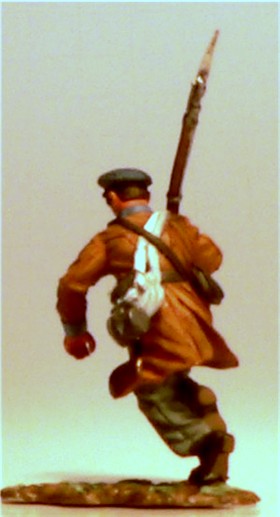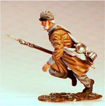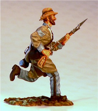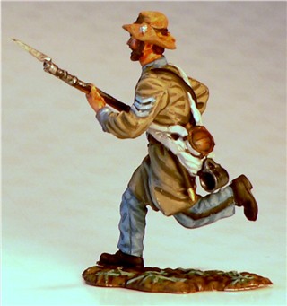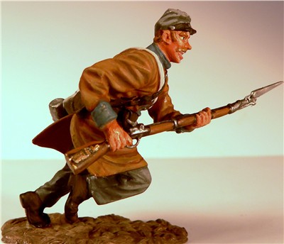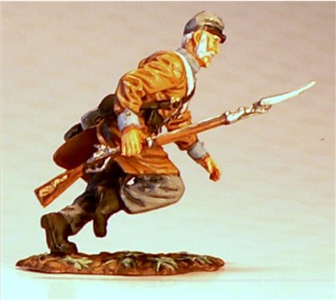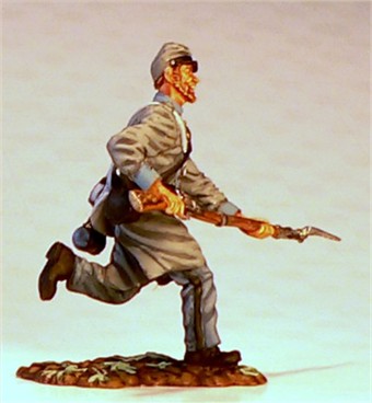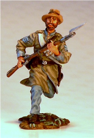 MMW54130 Confederate infantry, charging, rifle forward, 1st Texas Brigade 1862.  Cast in 54-mm scale lead free pewter.  Includes 1841 Mississippi musket.  Photo depicts figure painted by George Nieto.