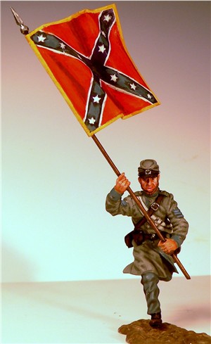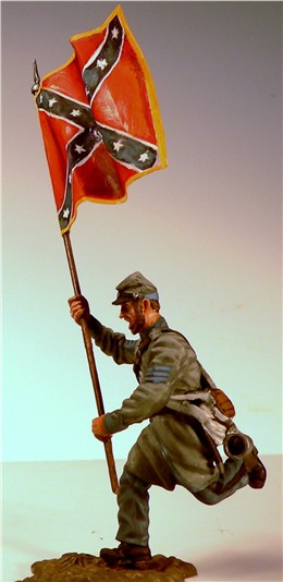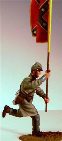 MMW54128 Confederate infantry sergeant, charging, holding flag, 1st Texas Brigade 1862.  Cast in 54-mm scale lead free pewter.  Also includes flag pole, flag spear, flag tassels, flag staff, metal foil flag.  Photo depicts figure painted by George Nieto.