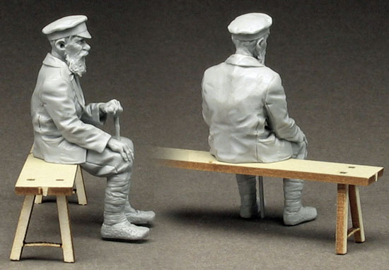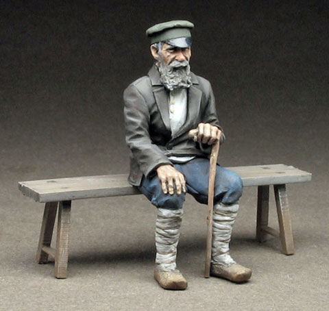 Old Russian man on bench, World War II era, 1/35 scale