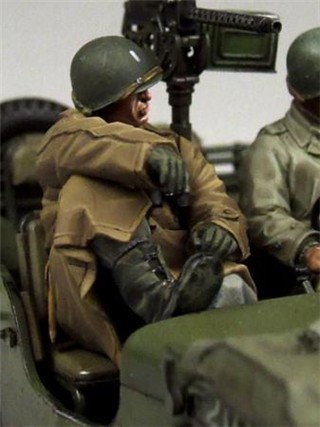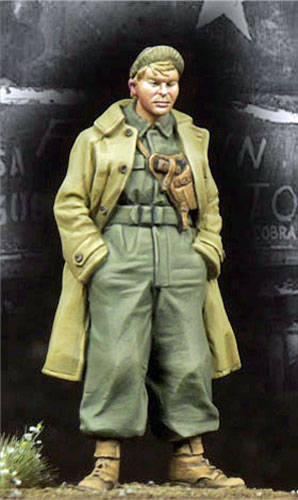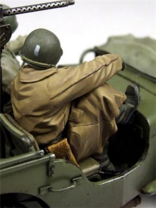 BOD35002 US Driver 1/35 scale resin figure, sculpted by Krisztian Bodi, box art painted by Oliver Kovacs.  This chauffeaur was made for the Tamiya Willys Jeep, but it fits other vehicles as a driver. The figure's clothing allows representation of winter, autumn and spring surroundings.  Perfect companion to US Officer wearing overcoat (#BOD35004) shown below.