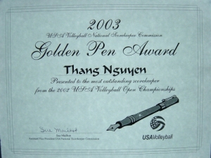 He was keeping score for a match at the same junior college around late 1996 when a referee unknown to him at the time came up and said, " So when are you going to come to one of my clinics to get certified?"  He replied by saying, " Certify? I already know how to keep score."  The referee turned out to be Steve Crane, Lone Star Region Scorekeeper Chairman, National Commissioner RVA Scorekeeper Development, and the 2003 Lauten Scorekeeper Service Award Winner.  This put things in motion as Thang received his Provisional Scorekeeper in 1997, Regional Scorekeeper in 1998, and Jr. National Scorekeeper rating in 1998 at the JO's in Dallas.  In 1999, he was asked to go get his USA National Scorekeeper rating in San Jose, Ca. at the Open Championships.