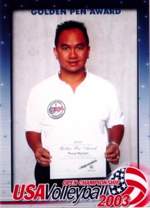 Nguyen is active in the Lone Star Region.  Since 1999, he has mentored and trained members as a clinician and rater.  He has served as a tournament director, head referee, and official's assignor.  He did some local jr. college assigning for 2 years.  He is currently the assignor for the Houston area private school boys league.  He has been active in every USAV Championships since 1999 as a scorekeeper at the Opens and a scorekeeper monitor for Sue Mailhot and referee at the Jr. Nationals.