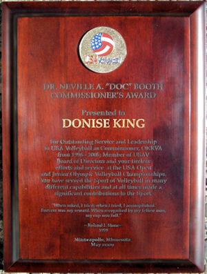 Presented for outstanding service and leadership to USA Volleyball as Commissioner, OKRVA from 1996 - 2005, member of USAV Board of Directors and your tireless efforts and service at the USA Open and Junior Olympic Volleyball Championships. You have served the sport of volleyball in many different capabilities and at all times made a significant contribution to the sport. |