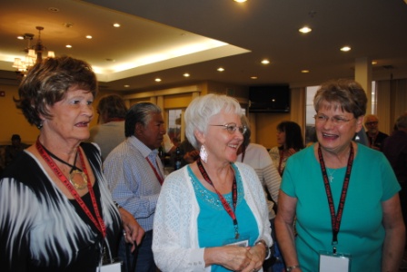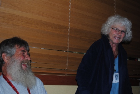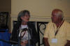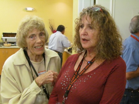 Sylvia McBlair and husband Chuck Clausen (left) talking to Nancy Rose Meeker