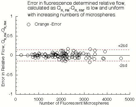 Results: Blood flows to each sample estimated from the Triton Technology Inc microspheres were compared to blood flows determined by the radioactive microsphere method. Correlations for all relative flow were R2 = .95 ± .05. Correlation plots, Bland-Altman plots, and tables are presented below. Discussion: Correlations for all four colors of fluorescent microspheres were generally excellent for both the extraction and digestion methods. Correlation for Lemon processed by 5 day extraction was slightly lower than other fluorescent colors, due to loss for some pieces with low numbers of microspheres. We have determined that Lemon dye is stable in 2Ethoxy over many months, when stored in a cool dark location. The cause of the loss remains unclear. Dye loading of microspheres was high, for some colors, resulting in high fluorscent intensity per microsphere, and limiting the flow range which can be measured without having to perform sample dilutions. For our Perkin LS50B fluorimeter, using standard slit widths of 4nms, the maximum number of microspheres per ml which can be measured without dilution are 3000 for Lemon, 3500 for Yellow, 2000 for Orange and 6500 for persimmon. In the current study we measured up to 4000 to 5000 FM per piece without dilution, by employing monochrometer slit widths of 2.5nm instead of 4nm. This reduces intensity 2.6 fold but increases noise in the measurement error. No quenching was observed for high flow pieces, with approximately 4000 to 5000 FM for each color. Order Information: Four colors are currently available through Triton Technology Inc., San Diego CA,. Fluorescent Lemon, Fluorescent Yellow, Fluorescent Orange and Fluorescent Persimmon, are $97 each, for 10ml alloquots of 106 microspheres per ml. |