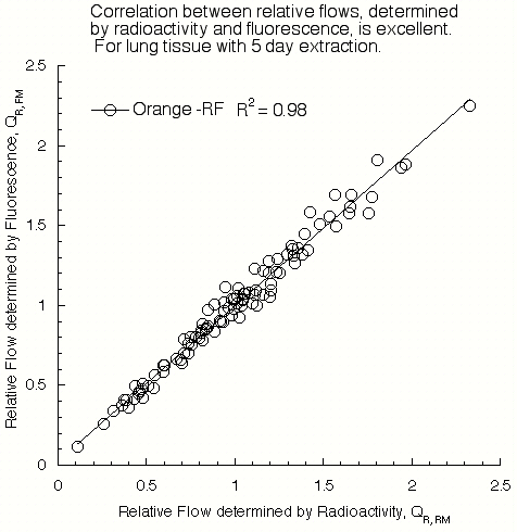 Description: Triton Technology Inc. has developed a four color set of fluorescent microspheres, Lemon, Yellow, Orange, and Persimmon, all 15µm in diameters, in concentrations of one million spheres per ml, and packed in 0.01% Tween 80 and 0.01% Thimerosal as a bacteriostat. We tested all four colors of fluorescent microspheres against the traditional radioactive microsphere method, using Ru103 (Dupont, NEN Research Products, Boston, MA) Methods: Studies were performed on two separate, anesthetized and mechanically ventilated rabbits. For experiment 1, approximately 200,000 microspheres each of the four fluorescent colors and one radioactive label were suspended in distilled water and 0.02% tween, then sonicated, vortexed, and mixed in one syringe for simultaneous injection. Microspheres were injected via a central venous line over 30 seconds. The animal was euthanatized by anesthetic overdose. The lungs were excised, flushed with saline until clear and dried at total lung capacity at a continuous airway pressure of 25 cmH20. Dry lung tissue was cubed into 100 pieces. For experiment 2, approximately one million microspheres each of the four fluorescent colors and one radioactive label were suspended in distilled water and 0.02% tween, then sonicated, vortexed, and mixed in one syringe for simultaneous injection. Microspheres were injected via an LV catherter, over 30 seconds. The rabbit was euthanatized by anesthetic overdose and organs removed. The heart, kidneys and muscle were sectioned into, 5, 14 and 3 pieces respectively, for a total of 22 samples. Radioactive count rates were determined for all lung and organ tissue samples and corrected for decay and background. Lung samples were soaked in 2 mls of 2-Ethoxy ethyl acetate (2Ethoxy) for five days, to extraction fluorescent dye. Organ tissue and reference bloods were processed using the digestion method in multi-stage filters (Perkin-Elmer) and diluted in 2 mls 2Ethoxy each. Some organ and blood samples were futher diluted to reduce microsphere concentrations per sample to a measurable range for fluorescent analysis. Blanks were diluted in 3 mls 2Ethoxy. Fluorescent intensities were determined for all samples using an automated spectrofluorimeter. Blood flow was calculated, relative to the mean flow for all pieces, for fluorescence and radioactivity.