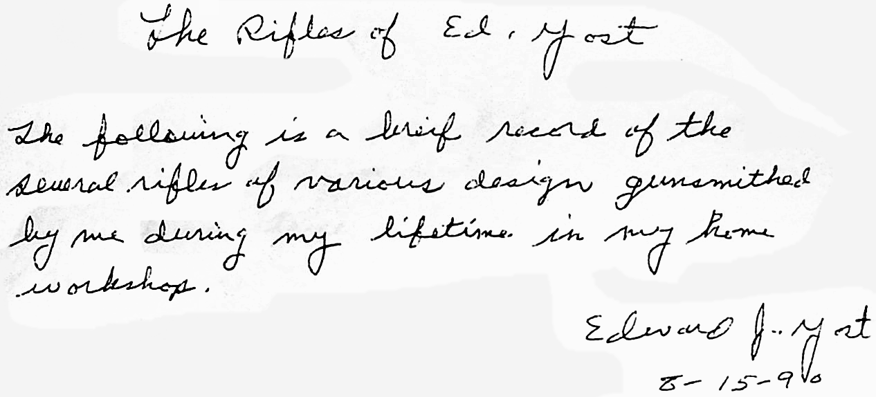"The following is a brief record of the several rifles of various design gunsmithed by me during my lifetime in my home workshop." Edward J. Yost 8-15-90
