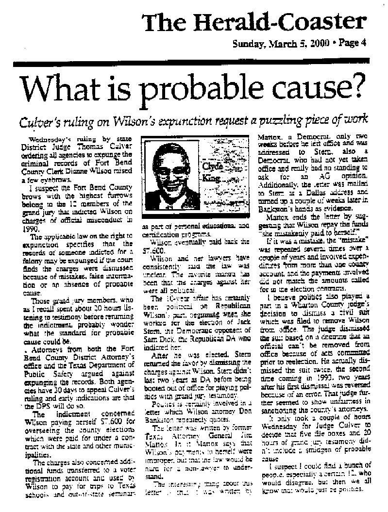 Before she obtained her degree from Kennedy-Western and began calling herself Dr. Dianne Wilson, PhD, a Grand Jury indicted the Fort Bend County Clerk in 1990 on charges she used taxpayer money to partially finance a Bachelor Degree from St. Edwards University and Certificates from the National Center for State Courts’ Institute for Court Management. (St. Edwards and the NCSC are accredited) Wilson eventually beat the charges after reimbursing the taxpayers $7600.00 and campaigning for Jack Stern, the Democratic opponent of Sam Dick, the District Attorney who indicted her. Once elected, Stern dismissed the charges against Wilson. Stern didn’t last two years before he was booted out of office for playing politics with Grand Jury Testimony.