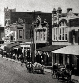 Street scene on Oak Street in Palestine in 1918 featuring horse drawn wagons and well dressed shoppers. |