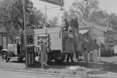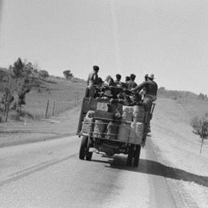 Mexican migrant workers returning from Mississippi where they had been picking cotton travel by truck to their next field site somewhere near Neches, Texas in 1939. |