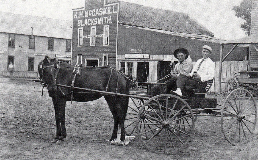 Blacksmith in Smithville 1891 - 1909Two men pause their horse-drawn wagon for a picture in front of K H McCaskill Blacksmith and Wheel Wright Shop in Smithville sometime between 1891 and 1909 |