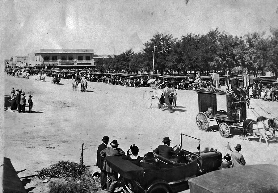 Early residents of Lubbock and surrounding area line the street with their Model Ts to watch elephants and and other exotic animals pull carriages and circus wagons in the circus parade in the 1910s |
