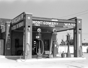 Montgomery Ward Gas Station Dalhart, Tx 1939Shields One Stop Service Sinclair gas station featuring Montgomery Ward tires in Dalhart.