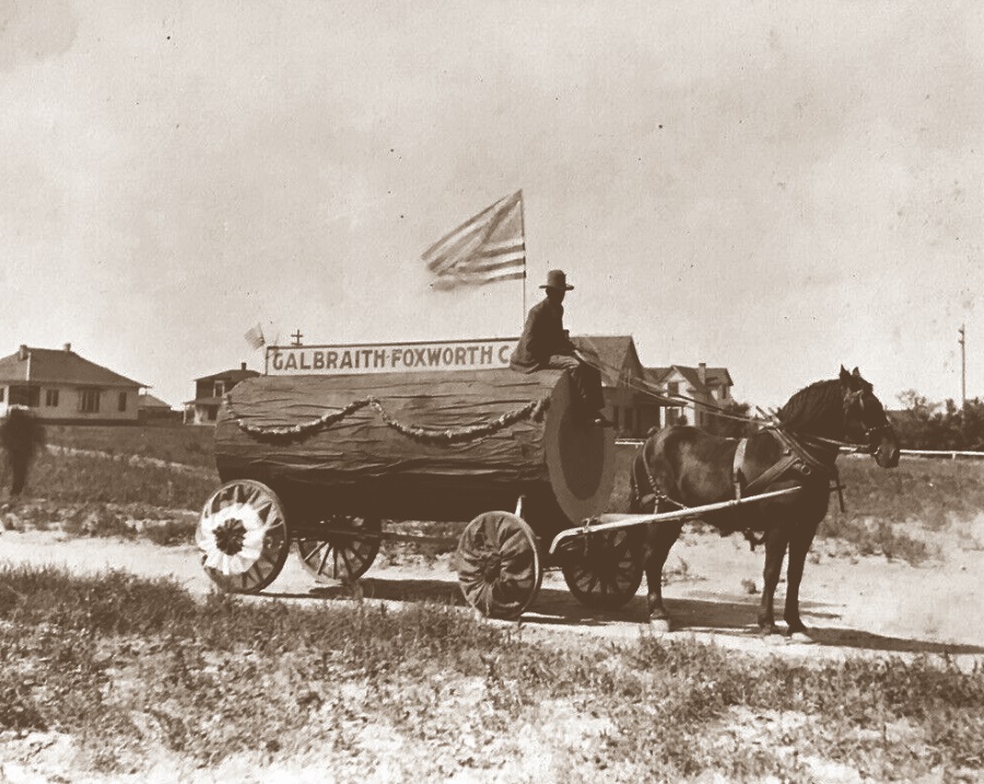 4th Parade Float in Dalhart Texas 1800'sHorse named "John" pulls decorated L&C Company delivery wagon through dirt street in front of Galbraith - Foxworth Company in Dalhart in 1800's. |
