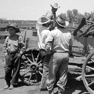 Gather around Wagon in 1939Cowboys gather around wagon loaded with brush in Dickens County in 1939. The older cowboy was a top hand nicknamed Shorty who worked for ranches across the area. . . . Zoom in |