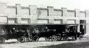 Ford Stephenville TxHigginbotham Ford Dealership in Stephenville Texas proudly displays their lineup of new Model T's on dirt street. |