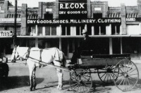 E. Cox General Store 1930Photo from 1930 depicts drayman named "Ross" with his wagon and horse in front of the R.E. Cox Dry Goods store in Stephenville Texas. |