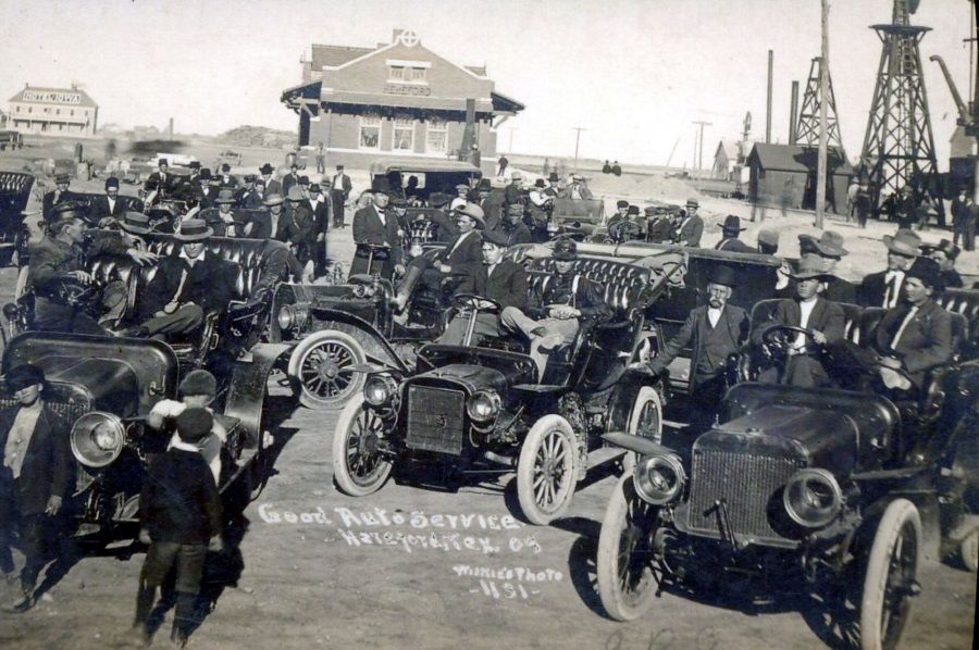 ![]() Hereford Texas Early 1900's Old photo of Hereford Texas from postcard advertising Good Auto Service proudly shows off new wealth with multitude of cars in front of the Hereford Railroad Depot |