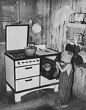 Boy taking gingerbread out of stove Corpus Christi 1940