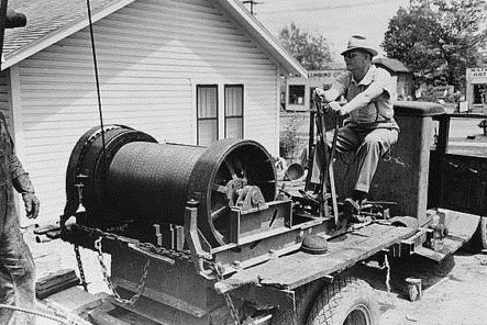 Portable winch and operator at oil well Kilgore, Texas in 1939