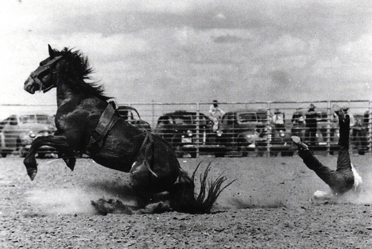 Cowboy Takes a Hard Fall in 1940 at Midland, Texas Rodeo
