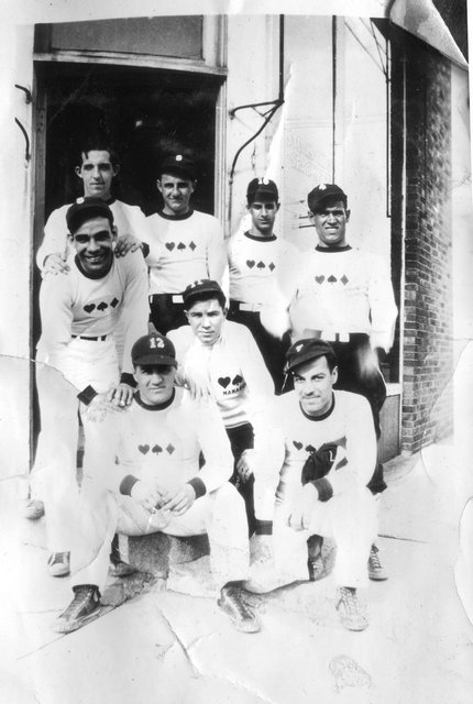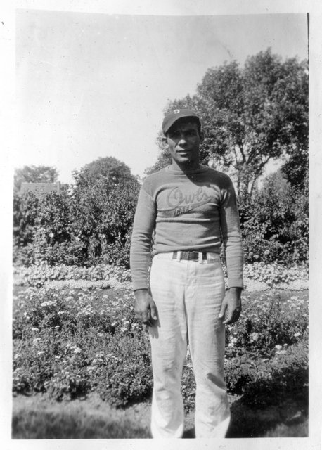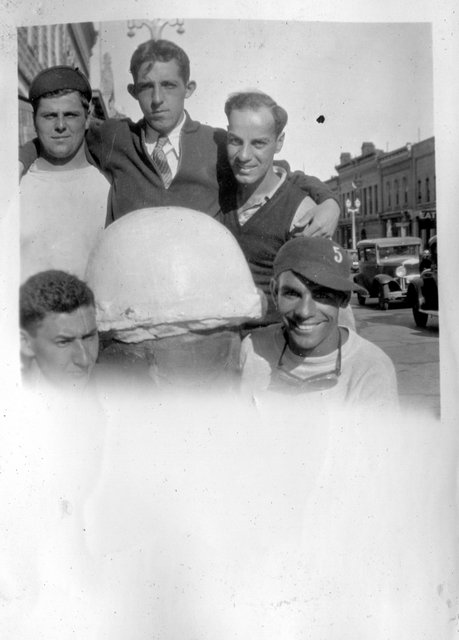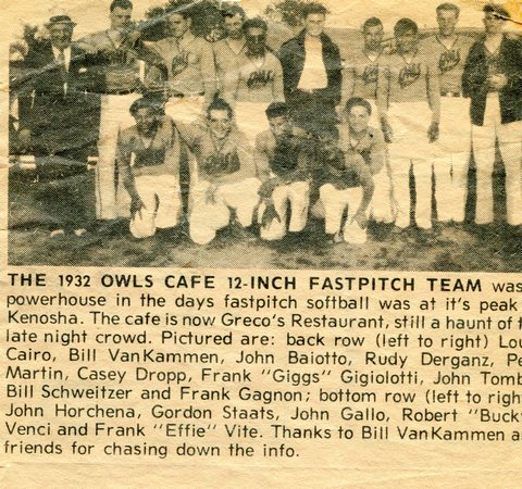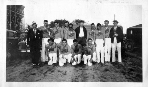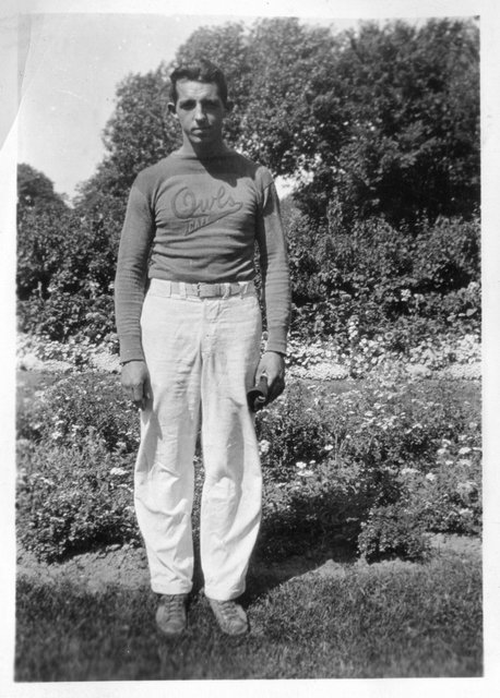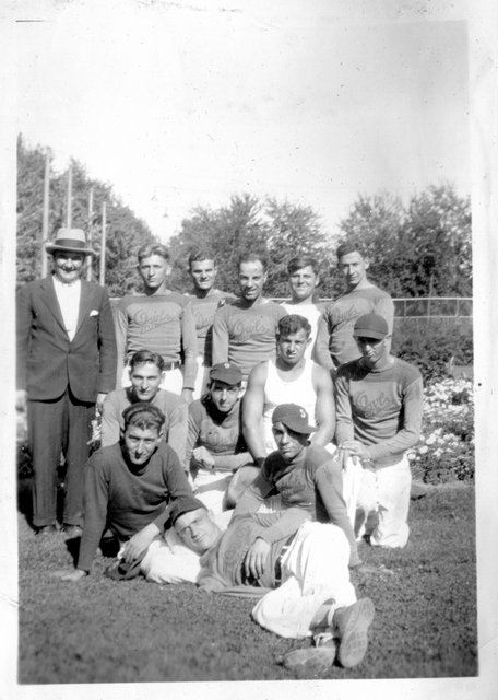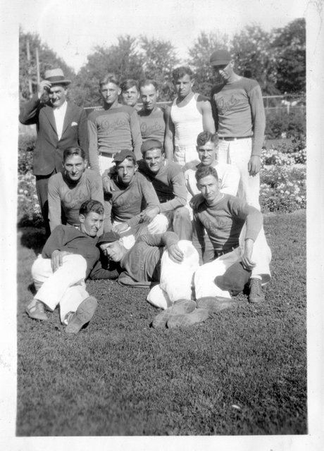 Here are photos of Gordon and his Owl's Cafe softball team. The team photo below is the same one from the newspaper clipping, with Gordon second from the left in the front row (with his right arm up on John's shoulder).